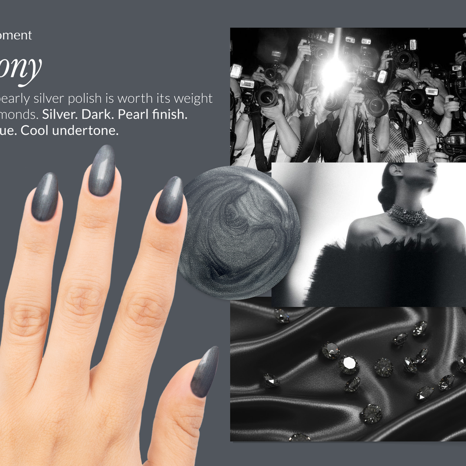 Gunmetal grey. Dark. Pearl finish. Opaque. Cool undertone.